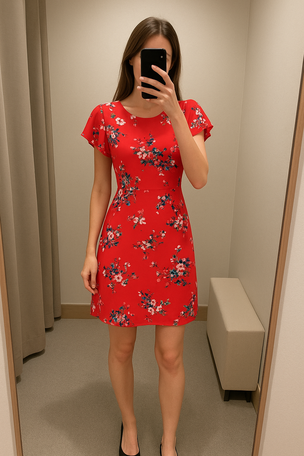 Une personne en robe rouge fleurie cambrant légèrement le dos pour une pose dynamique, avec une silhouette fine, dans une cabine d’essayage de style boutique avec un miroir et une décoration neutre.
