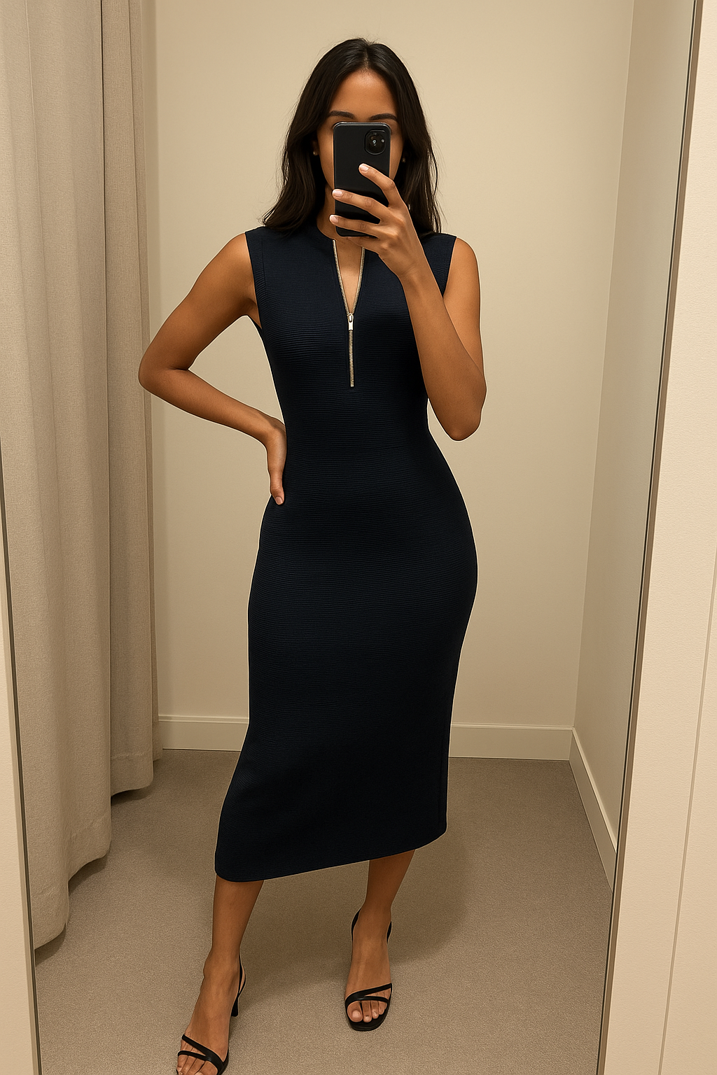 Une personne en Robe sans manches - H&M - Bleu - Taille S cambrant légèrement le dos pour une pose dynamique, avec une silhouette fine, dans une cabine d’essayage de style boutique avec un miroir et une décoration neutre.
