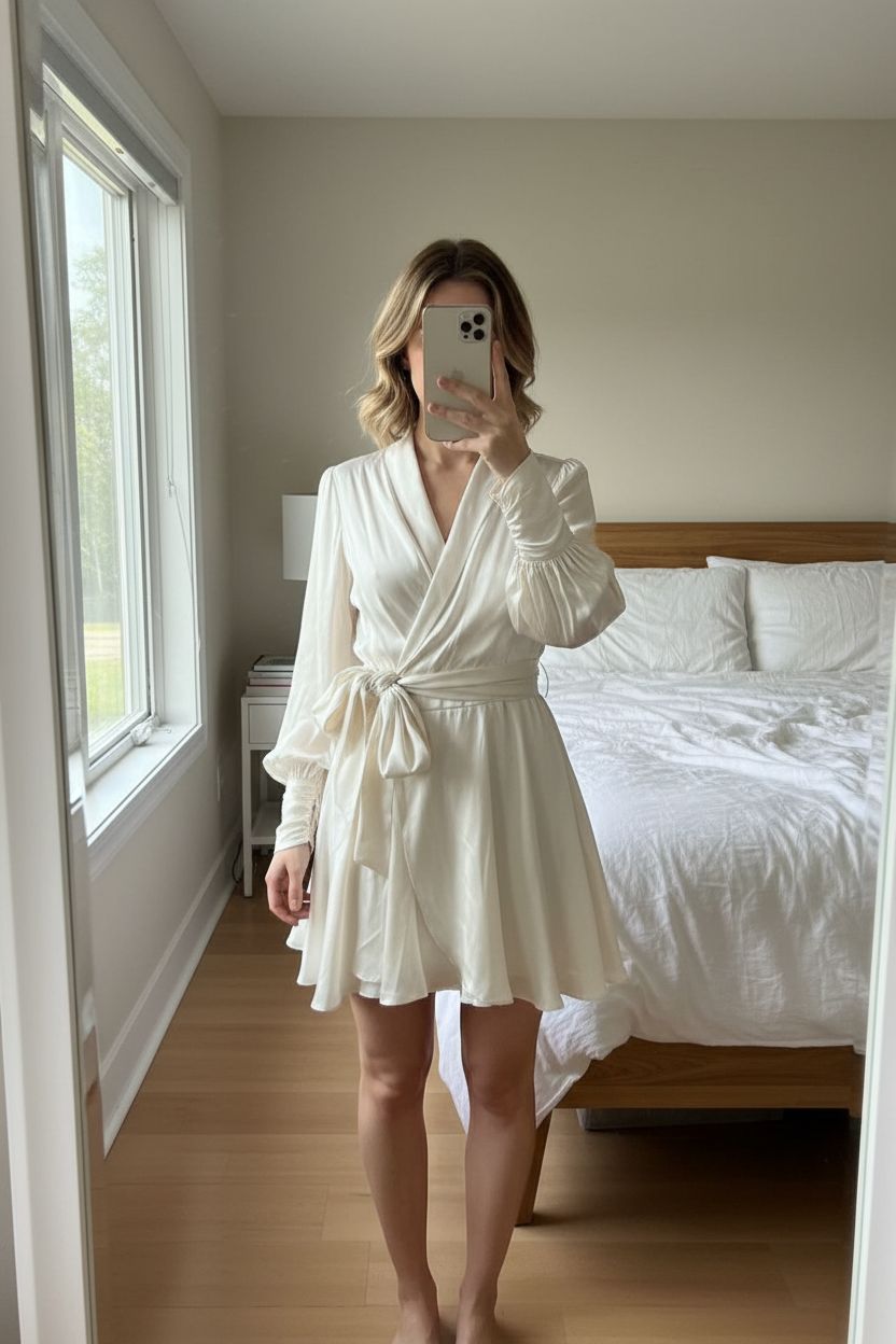 Robe soie Zimmermann taille 1 debout, face à la caméra, dans une chambre à la lumière douce, avec une lumière naturelle filtrant par la fenêtre.
