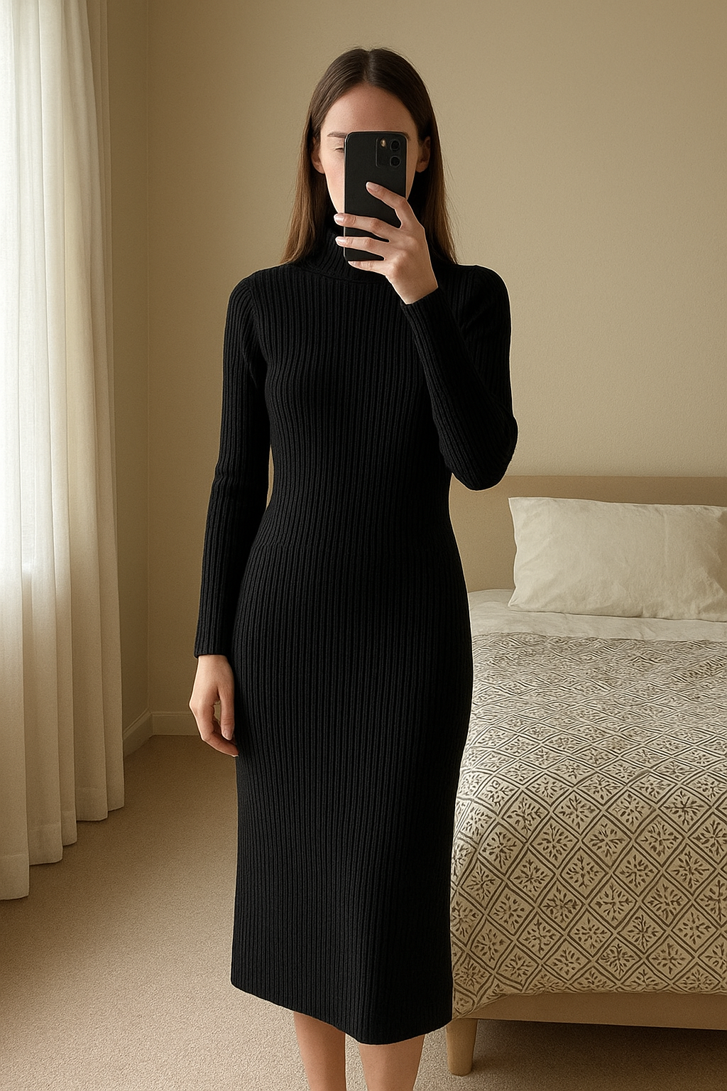 Robe sous-pull noire debout, face à la caméra, dans une chambre à la lumière douce, avec une lumière naturelle filtrant par la fenêtre.