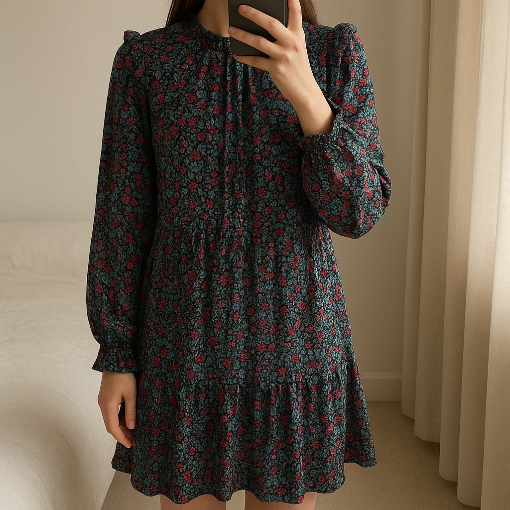 Robe Springfield fleurie Taille 38 debout, face à la caméra, dans une chambre à la lumière douce, avec une lumière naturelle filtrant par la fenêtre.