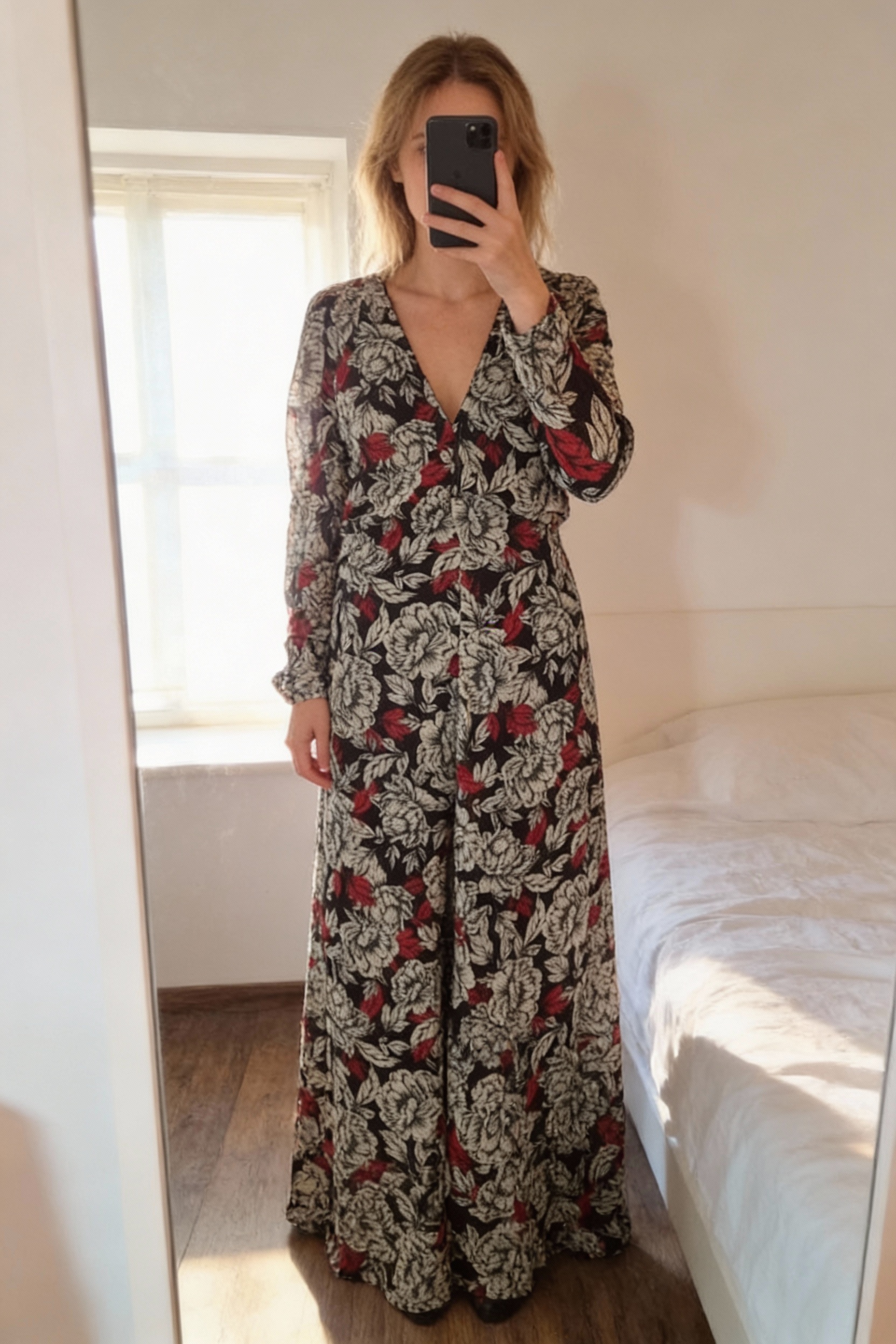 robe été longue MNG marron taille L debout, face à la caméra, dans une chambre à la lumière douce, avec une lumière naturelle filtrant par la fenêtre.