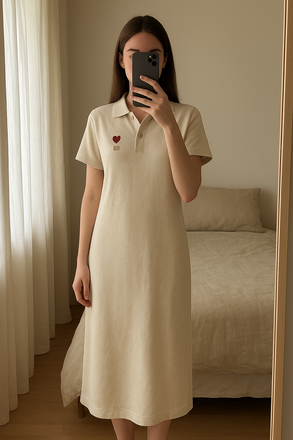 Robe t-shirt debout, face à la caméra, dans une chambre à la lumière douce, avec une lumière naturelle filtrant par la fenêtre.