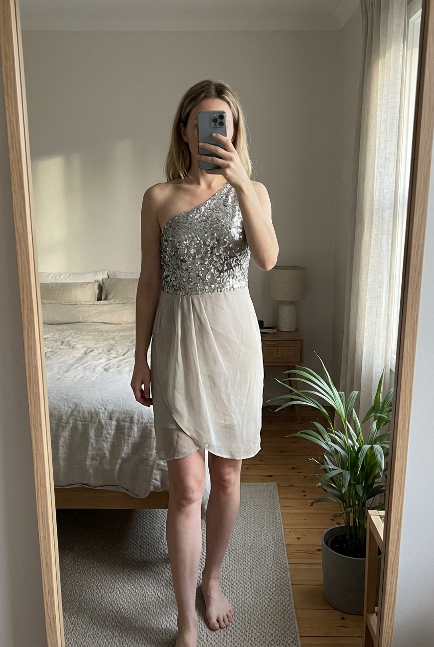 Robe taille 38 / Vestido talla M de pie, mirando a la cámara, en un dormitorio con luz suave y natural filtrándose por la ventana.