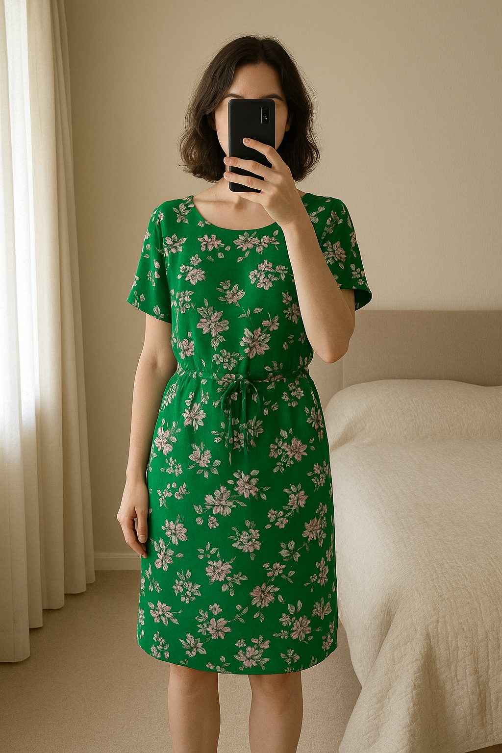 Robe verte Only🍃 debout, face à la caméra, dans une chambre à la lumière douce, avec une lumière naturelle filtrant par la fenêtre.