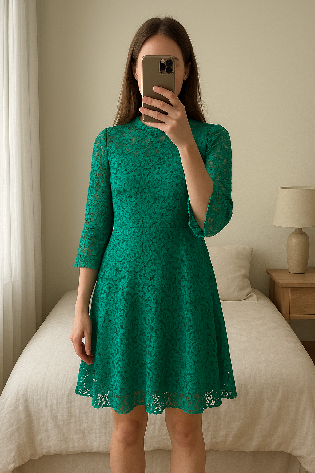 Robe verte Zara 🍃 debout, face à la caméra, dans une chambre à la lumière douce, avec une lumière naturelle filtrant par la fenêtre.