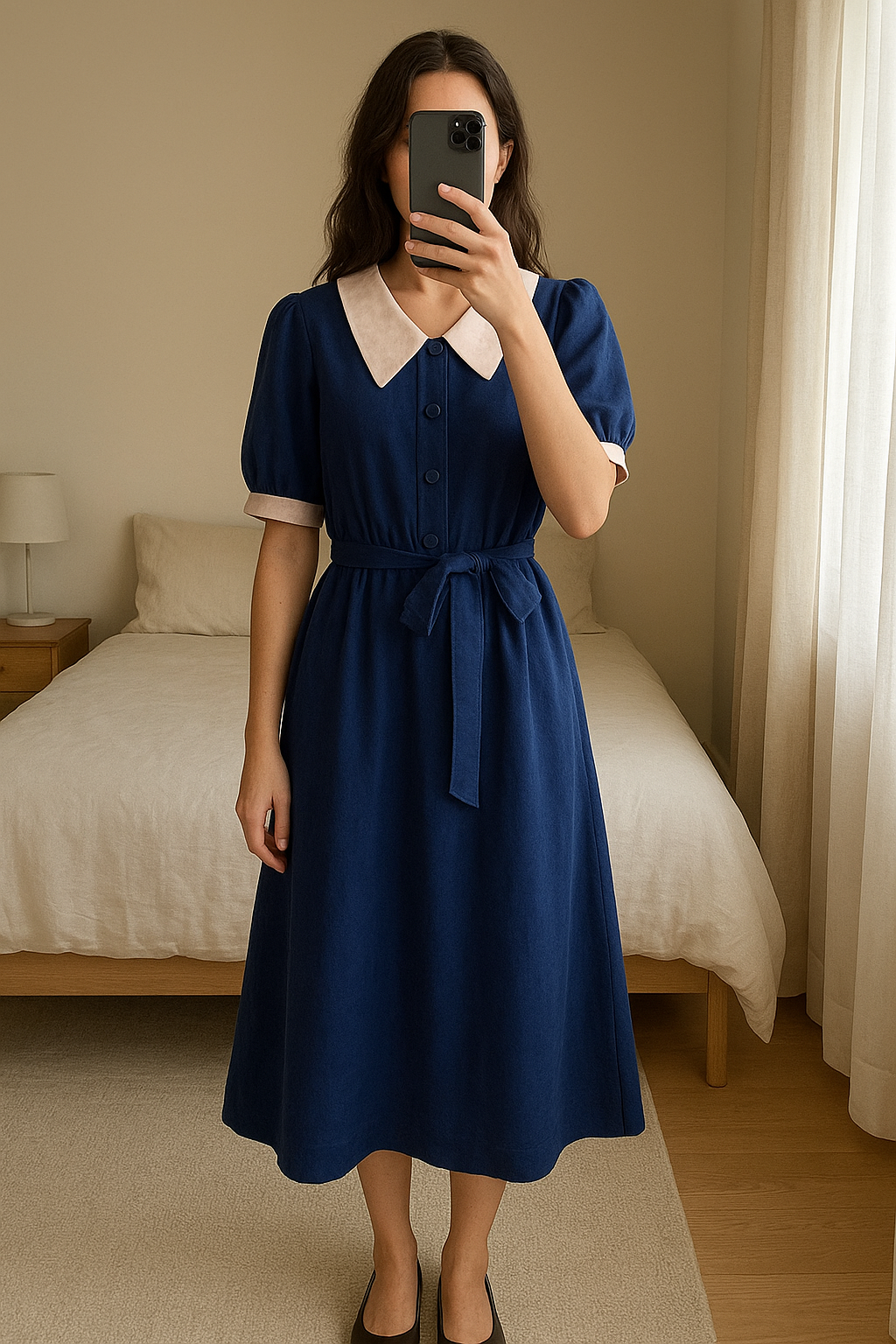 Robe vintage 70s debout, face à la caméra, dans une chambre à la lumière douce, avec une lumière naturelle filtrant par la fenêtre.