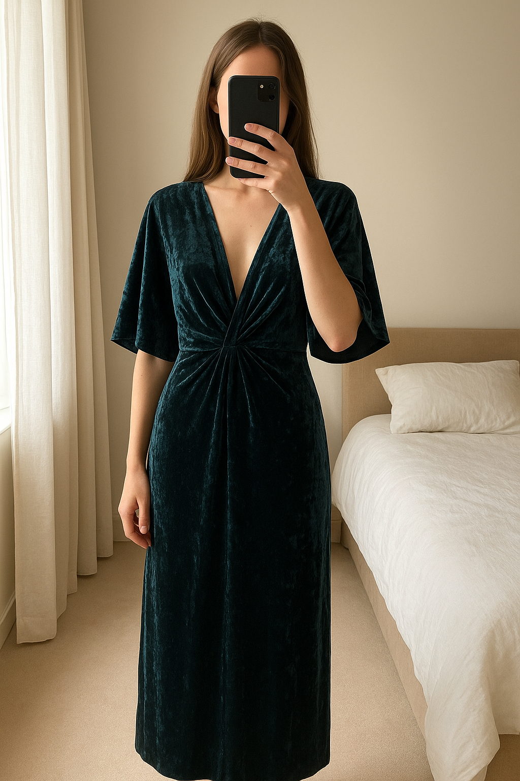 Robe Zara debout, face à la caméra, dans une chambre à la lumière douce, avec une lumière naturelle filtrant par la fenêtre.