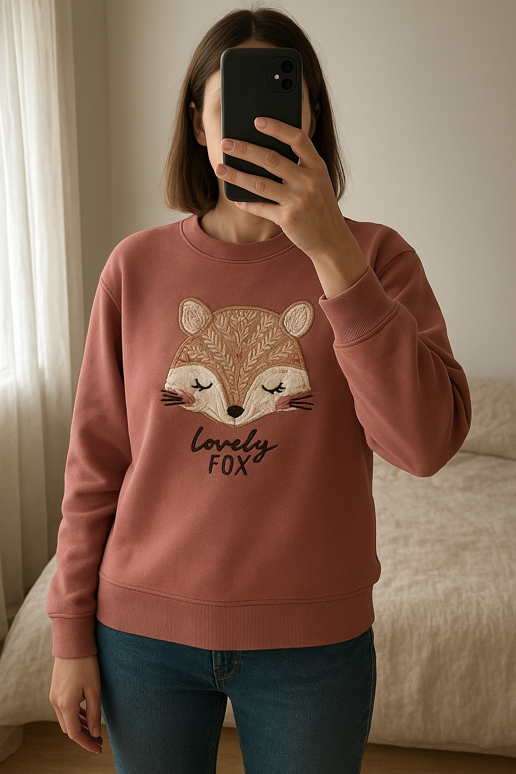 Süßer Fuchs Pulli C&A Größe 62 aufrecht stehend, der Kamera zugewandt, in einem sanft beleuchteten Schlafzimmer, mit natürlichem Licht, das durch ein Fenster fällt.