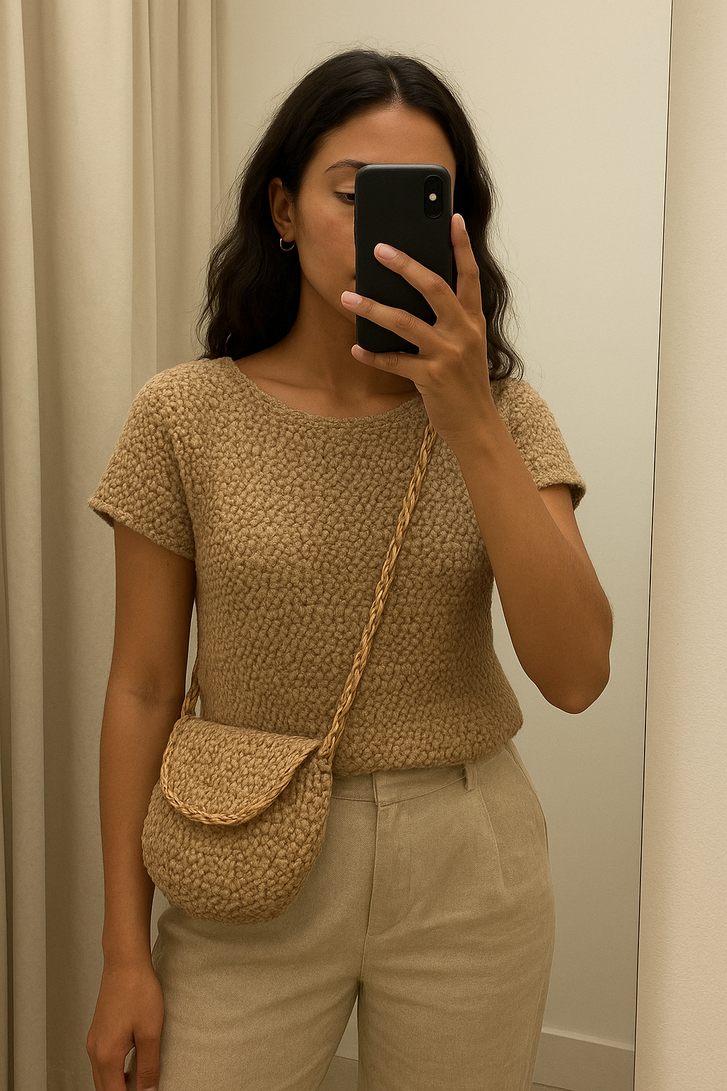 Une personne en Sac bohème forme besace cambrant légèrement le dos pour une pose dynamique, dans une cabine d’essayage de style boutique avec un miroir et une décoration neutre.