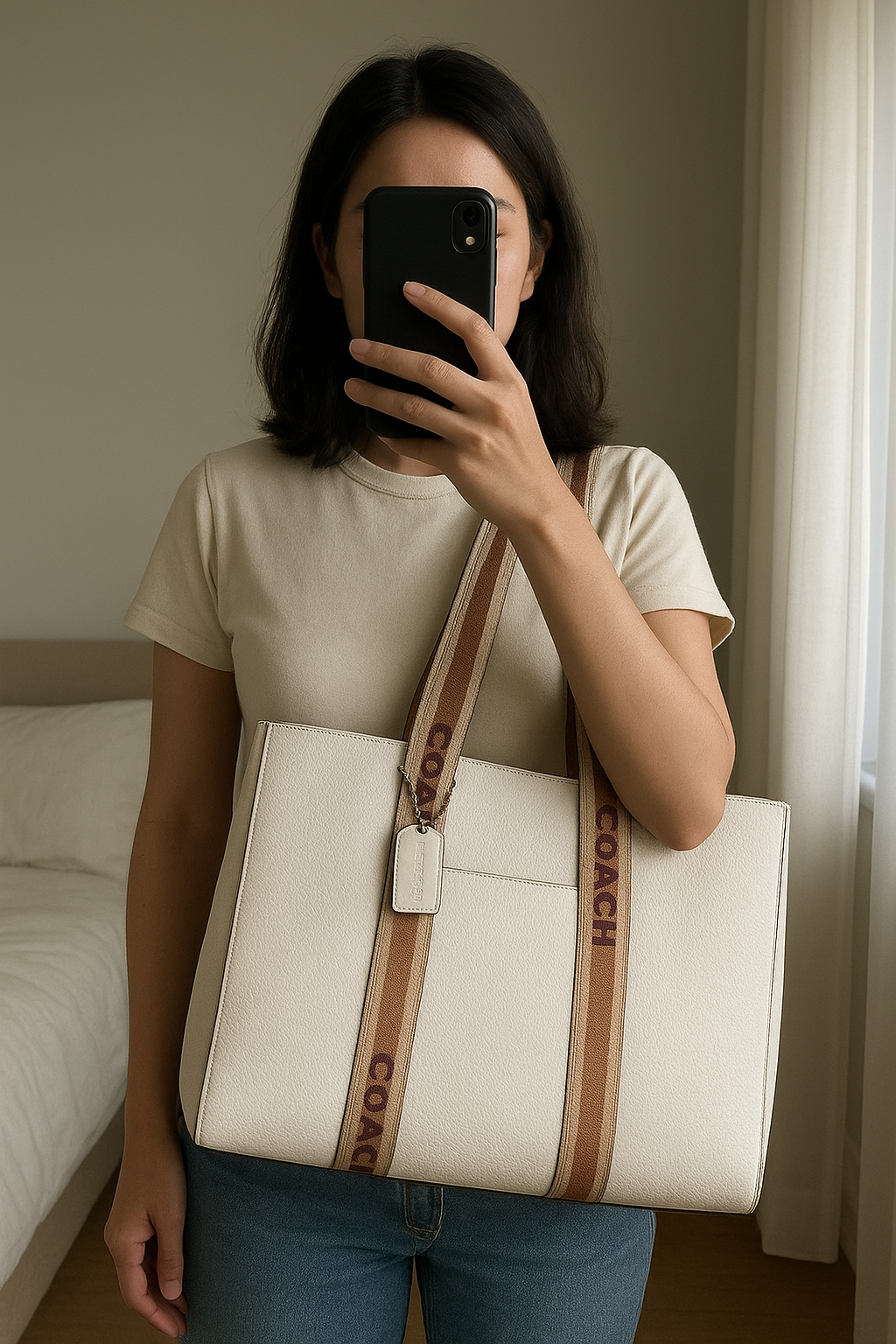 Sac Coach debout, face à la caméra, dans une chambre à la lumière douce, avec une lumière naturelle filtrant par la fenêtre.