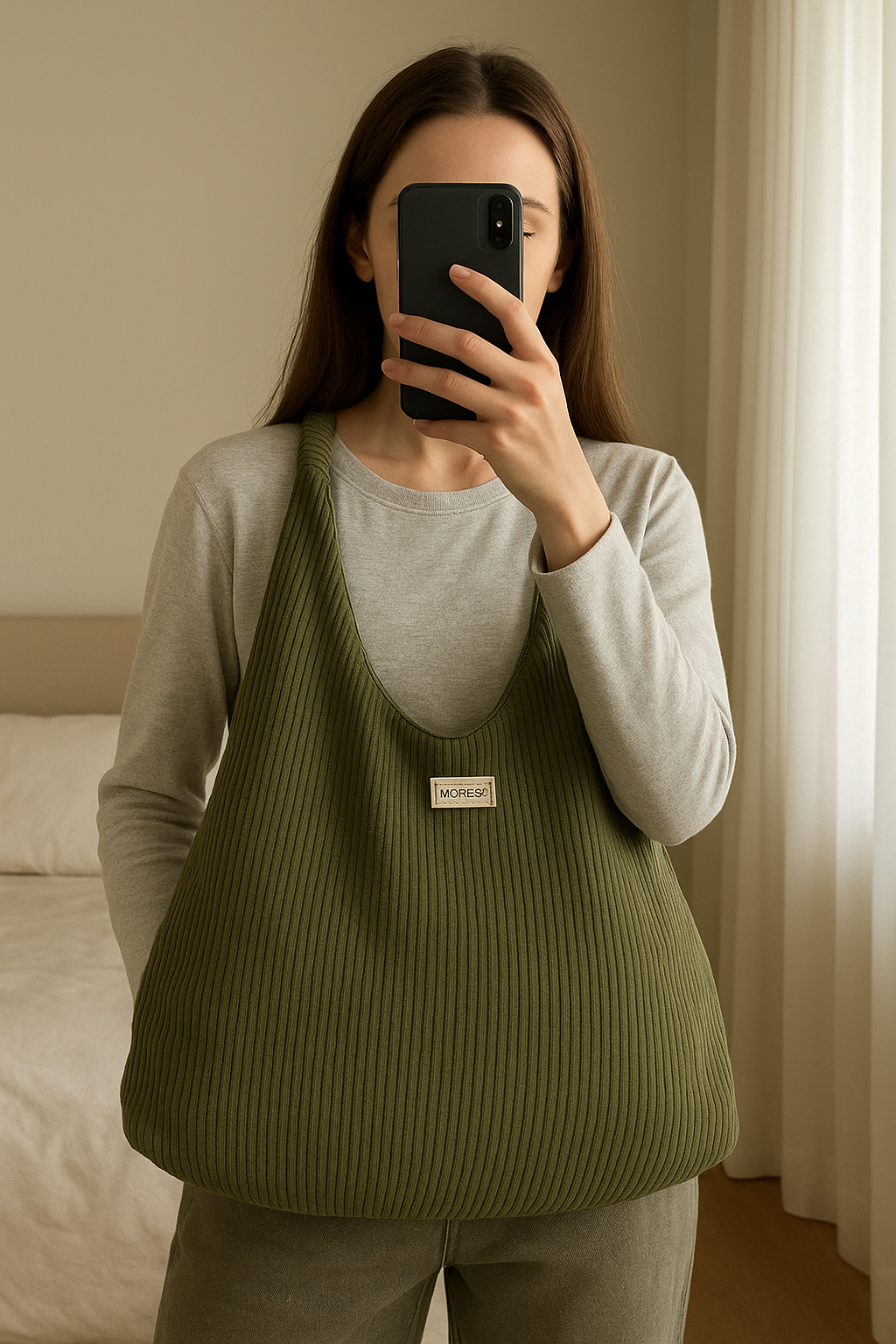 Sac en velours côtelé debout, face à la caméra, dans une chambre à la lumière douce, avec une lumière naturelle filtrant par la fenêtre.