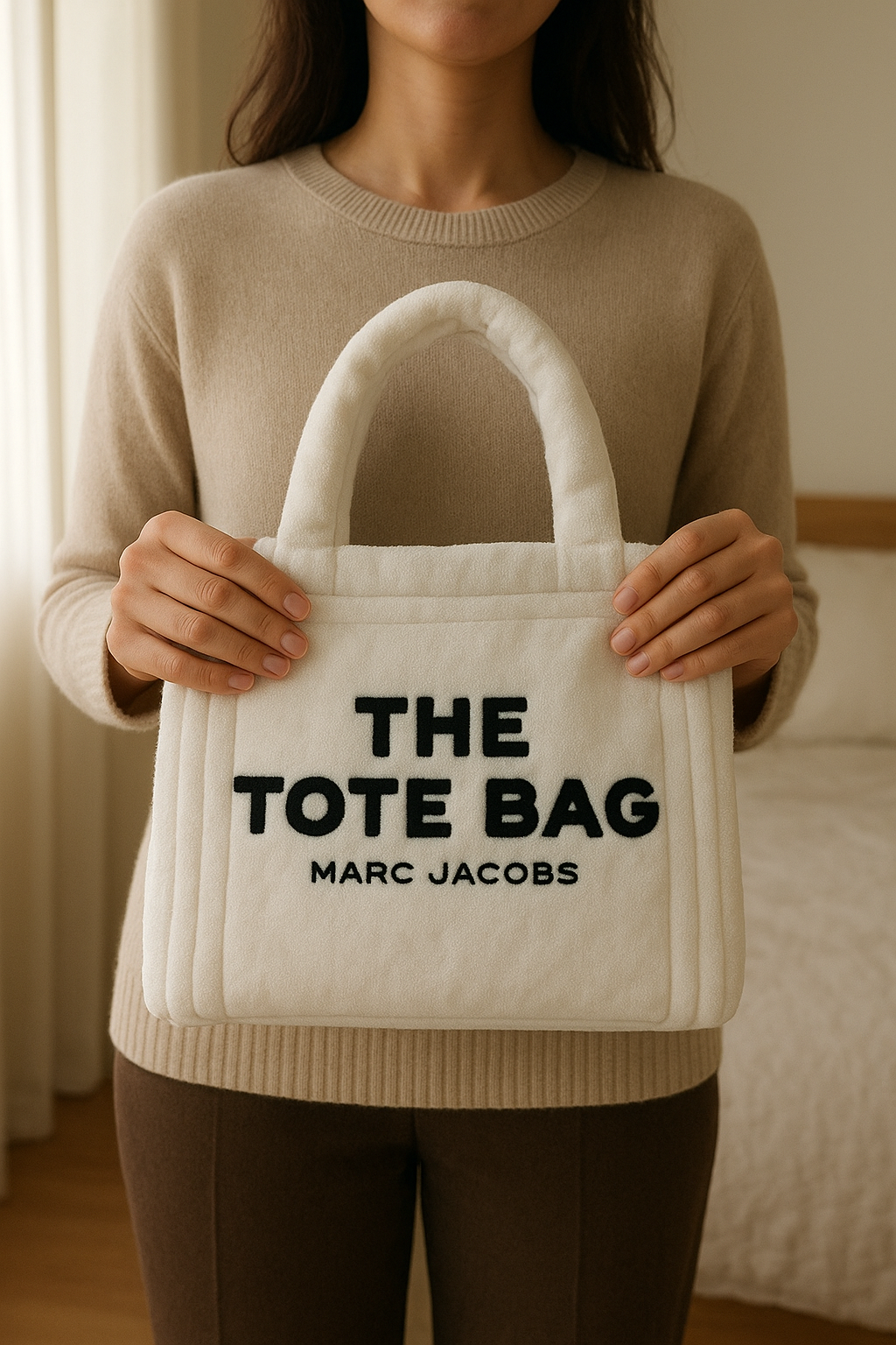 Sac Marc Jacobs debout, face à la caméra, dans une chambre à la lumière douce, avec une lumière naturelle filtrant par la fenêtre.