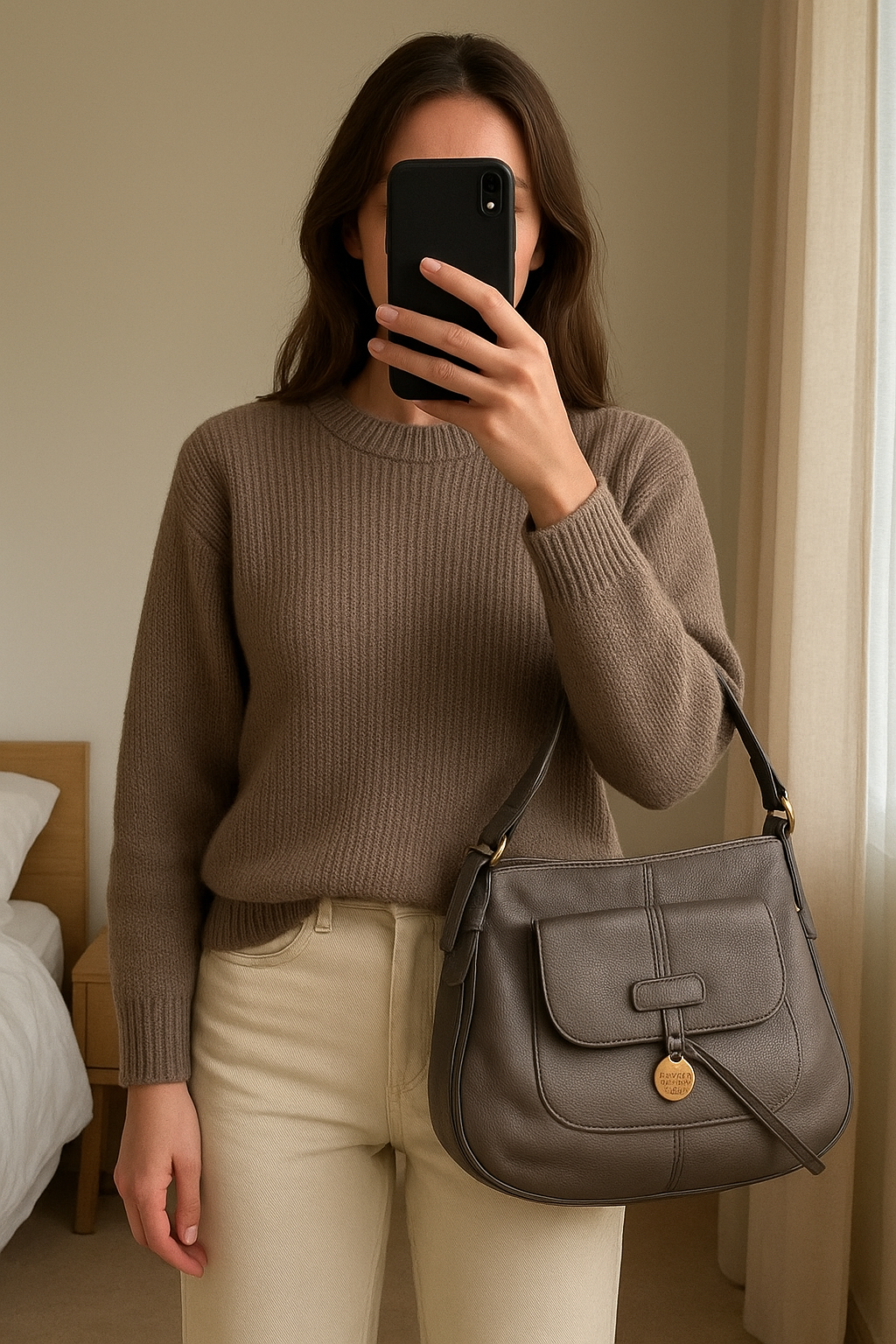 Sac see by Chloé debout, face à la caméra, dans une chambre à la lumière douce, avec une lumière naturelle filtrant par la fenêtre.