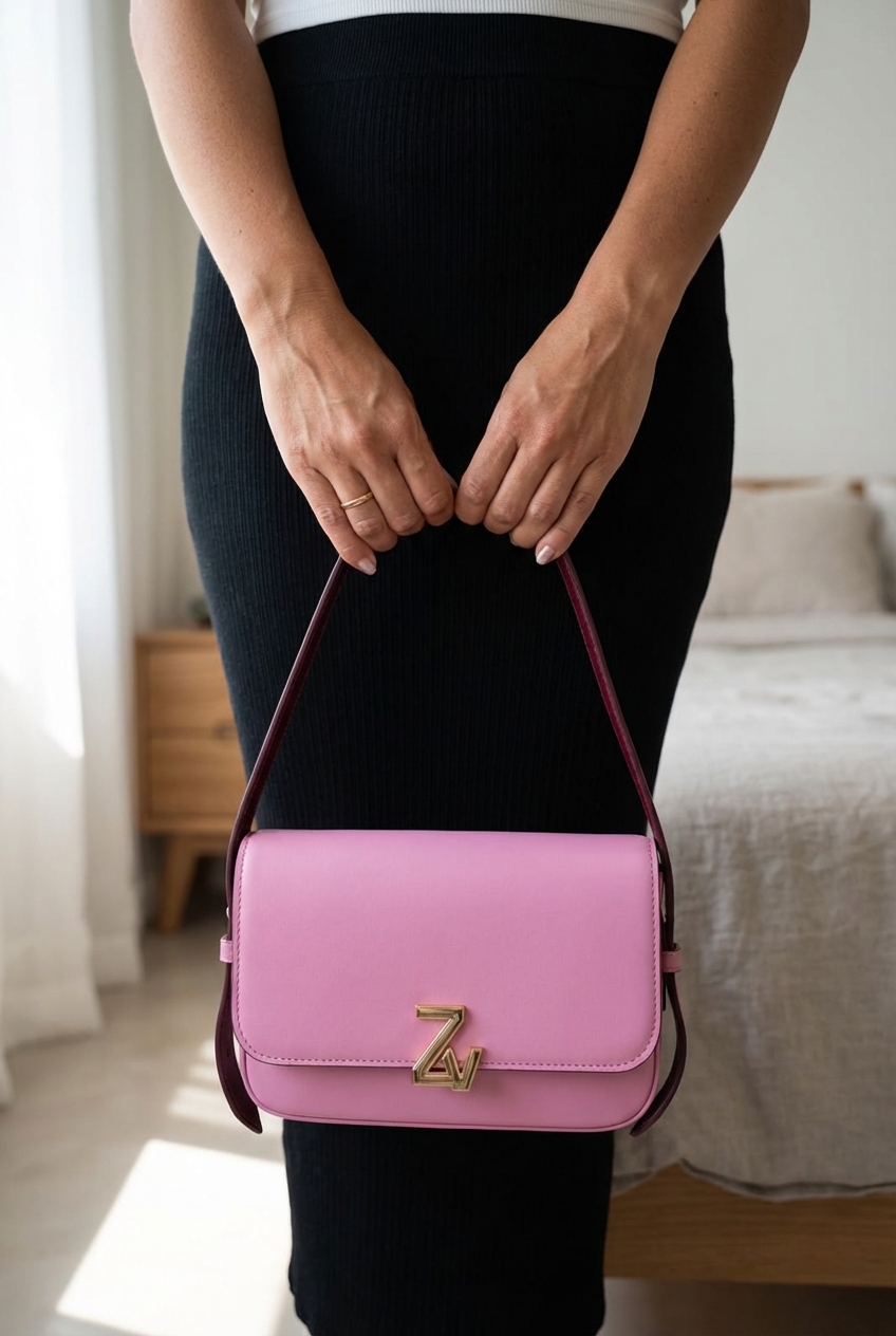 Sac Zadig & Voltaire debout, face à la caméra, dans une chambre à la lumière douce, avec une lumière naturelle filtrant par la fenêtre.