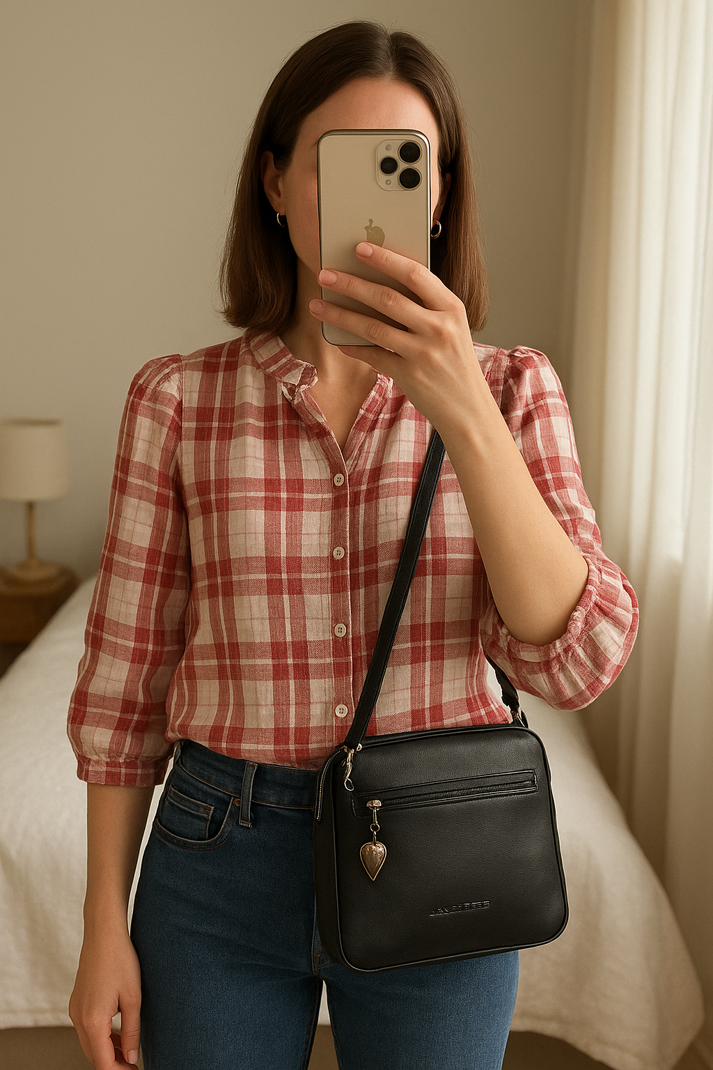 Sacoche Lancaster femme debout, face à la caméra, dans une chambre à la lumière douce, avec une lumière naturelle filtrant par la fenêtre.