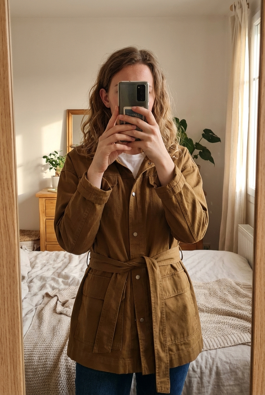 Saharienne Cyrillus couleur tabac taille 42 debout, face à la caméra, dans une chambre à la lumière douce, avec une lumière naturelle filtrant par la fenêtre.
