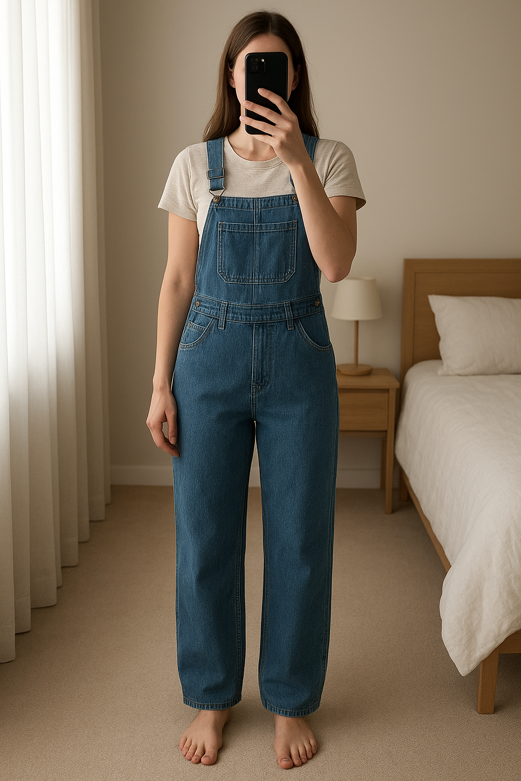 Salopette Asos taille 36 debout, face à la caméra, dans une chambre à la lumière douce, avec une lumière naturelle filtrant par la fenêtre.