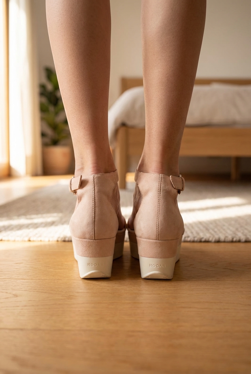 Sandales compensées Hogan debout, face à la caméra, dans une chambre à la lumière douce, avec une lumière naturelle filtrant par la fenêtre.