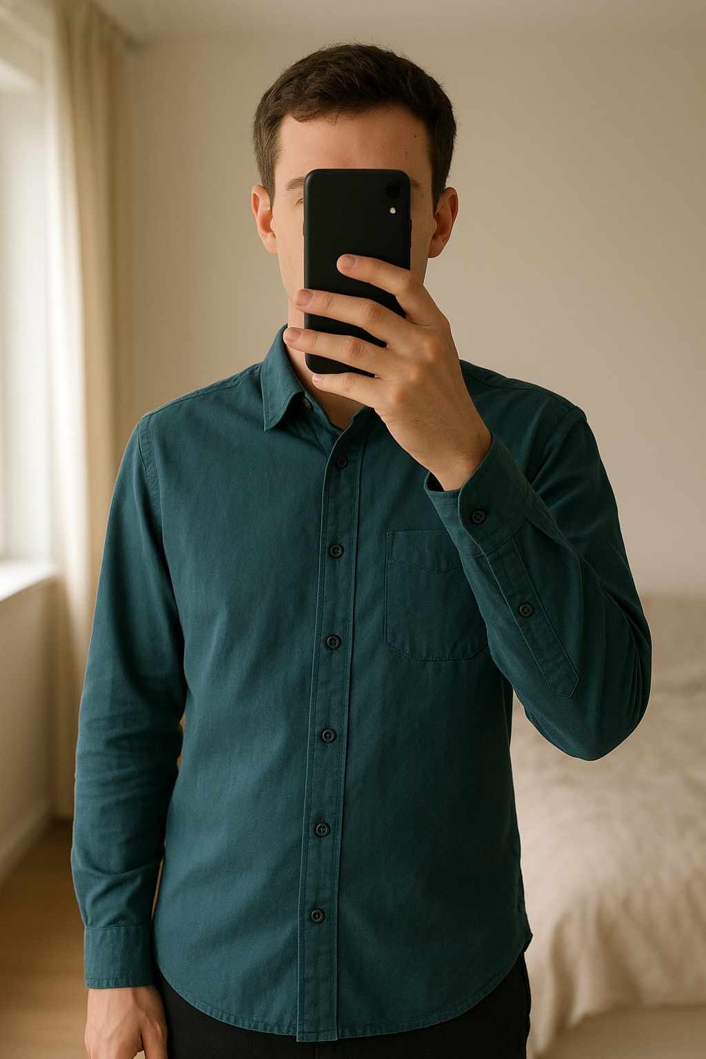 Scout Men’s Green Button-Up Shirt – Size M – Good Condition standing straight facing the camera, in a softly lit bedroom setting, with gentle natural light filtering through a window.