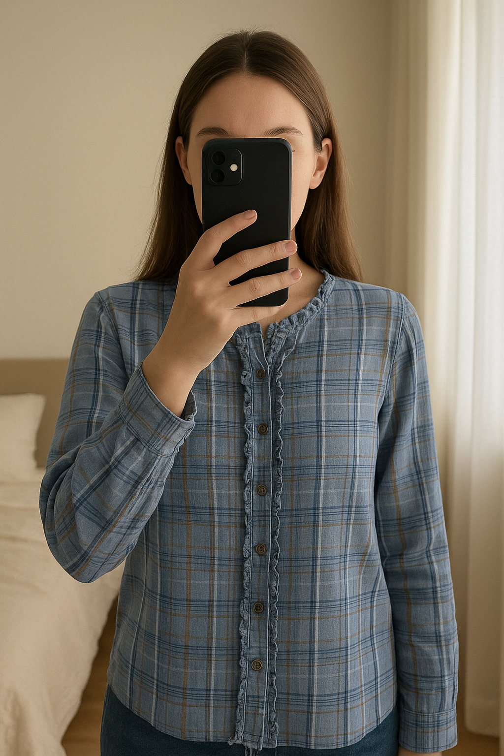 Seasalt Cornwall – Cornflower Bunch Top – Cornflower Blue Check – UK 10 standing straight facing the camera, in a softly lit bedroom setting, with gentle natural light filtering through a window.