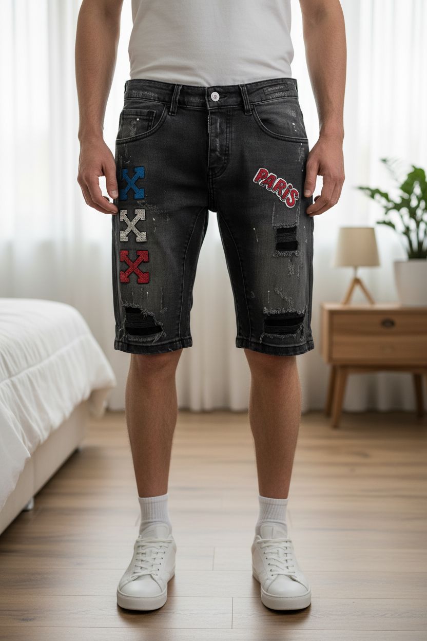 Short en jean noir Dsquared2 debout, face à la caméra, dans une chambre à la lumière douce, avec une lumière naturelle filtrant par la fenêtre.