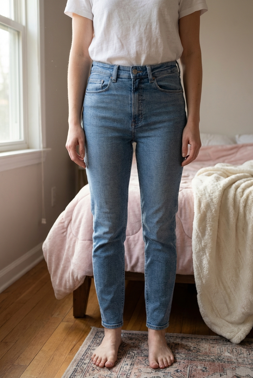 skinny taille haute debout, face à la caméra, dans une chambre à la lumière douce, avec une lumière naturelle filtrant par la fenêtre.