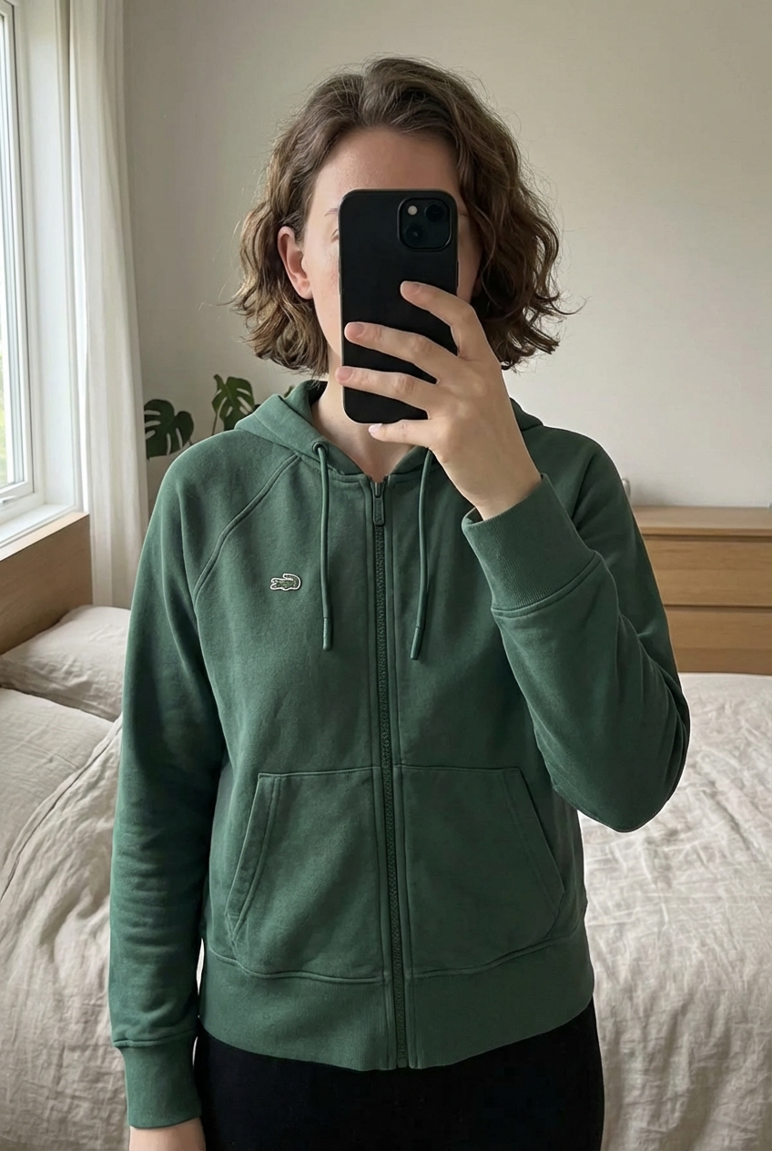 💚 Sudadera Lacoste con capucha – Nueva con etiqueta 💚 de pie, mirando a la cámara, en un dormitorio con luz suave y natural filtrándose por la ventana.