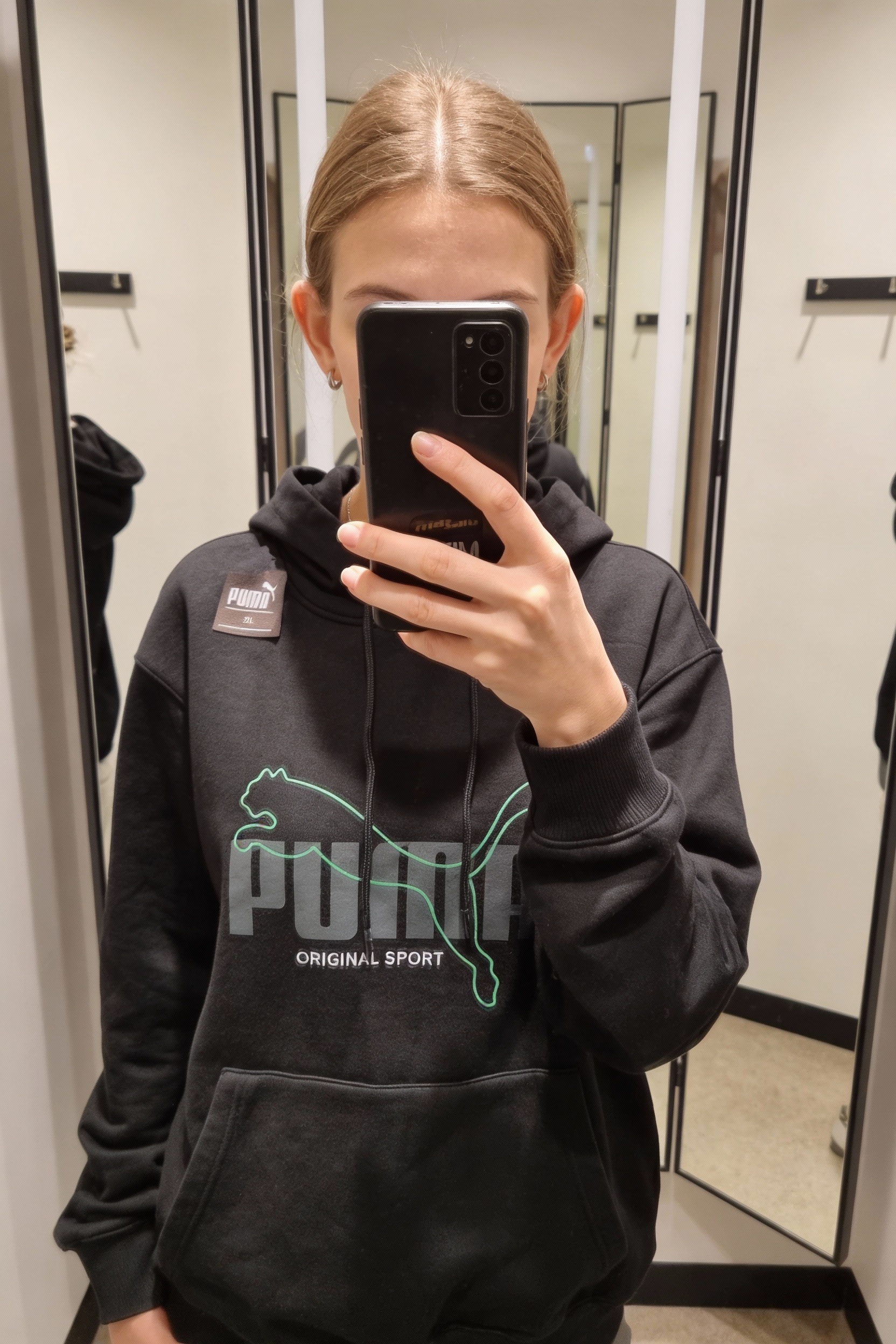 Una persona con Sudadera vintage Puma talla mujer de pie, mirando a la cámara, en un probador con estilo boutique, con espejo y decoración neutra.
