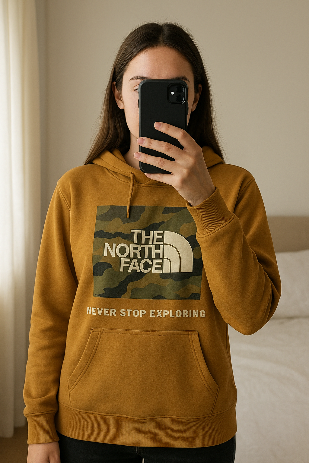 Suite à capuche, The North face debout, face à la caméra, dans une chambre à la lumière douce, avec une lumière naturelle filtrant par la fenêtre.