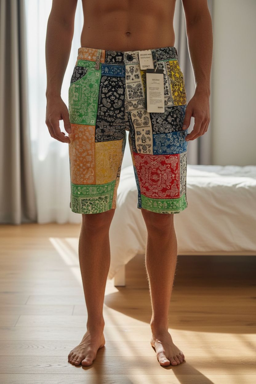 Summer shorts Esprit size W36 NEW debout, face à la caméra, dans une chambre à la lumière douce, avec une lumière naturelle filtrant par la fenêtre.