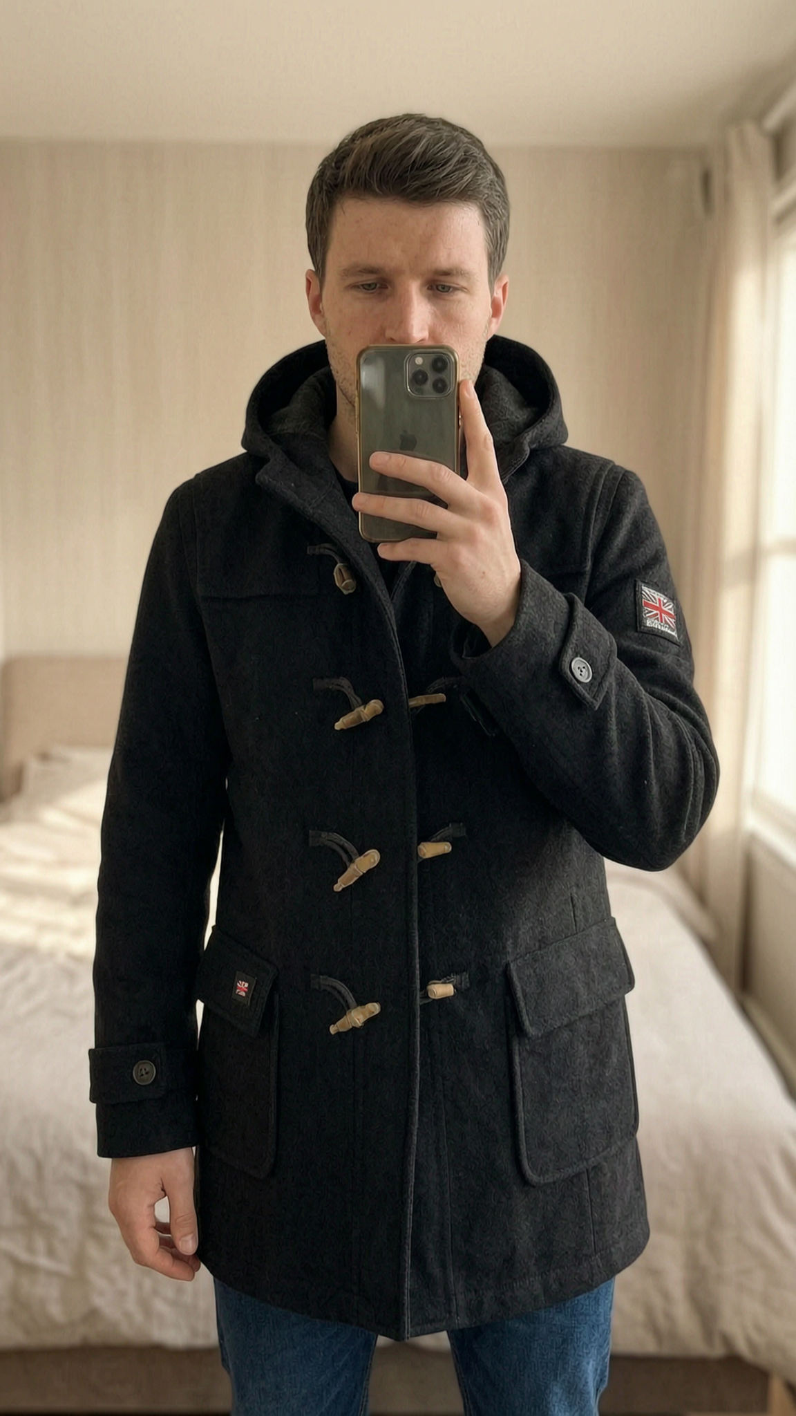 Une personne en Superdry duffle-coat noir / homme / L / capuche / manteau chaud debout, face à la caméra, dans une chambre à la lumière douce, avec une lumière naturelle filtrant par la fenêtre.