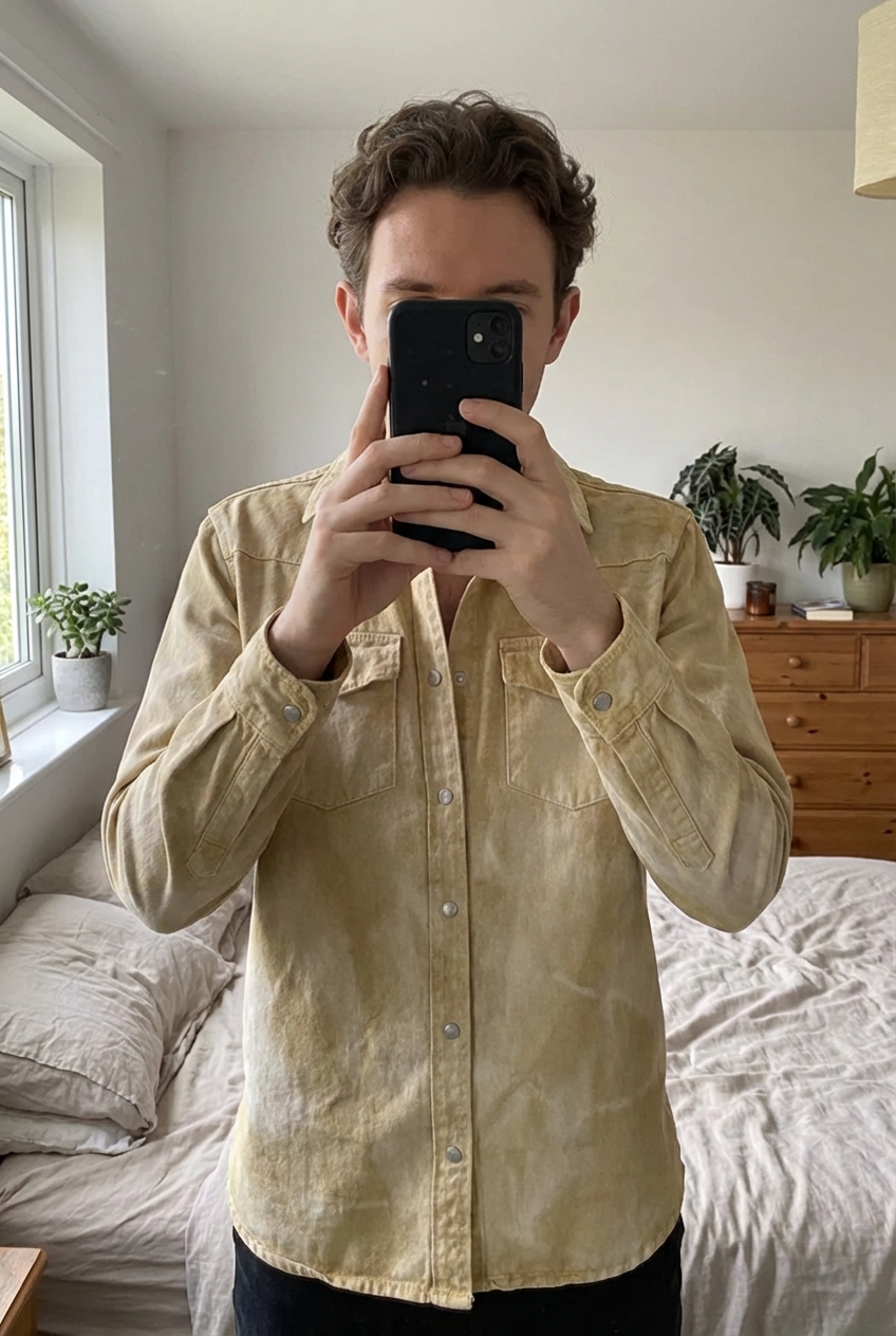 Surchemise à col coupe décontractée debout, face à la caméra, dans une chambre à la lumière douce, avec une lumière naturelle filtrant par la fenêtre.