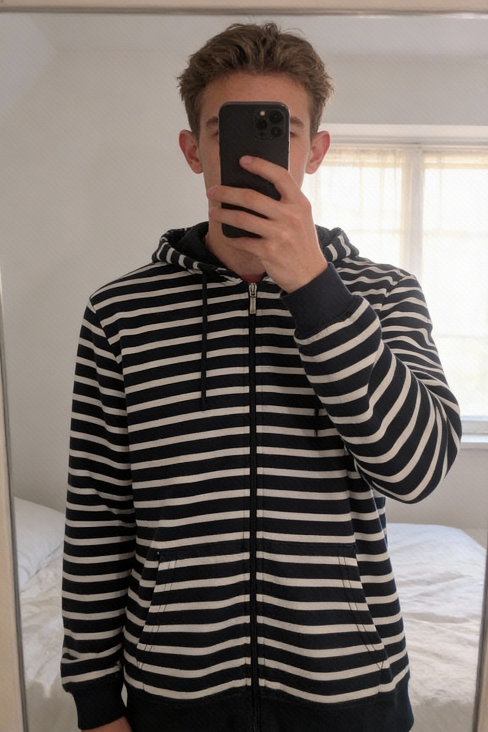 Sweat a capuche Capitaine Corsair debout, face à la caméra, dans une chambre à la lumière douce, avec une lumière naturelle filtrant par la fenêtre.