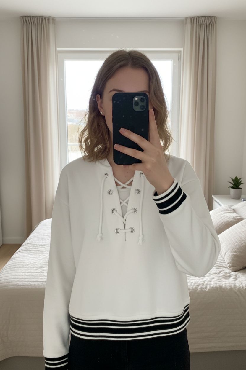 Sweat blanc taille XS/34 debout, face à la caméra, dans une chambre à la lumière douce, avec une lumière naturelle filtrant par la fenêtre.