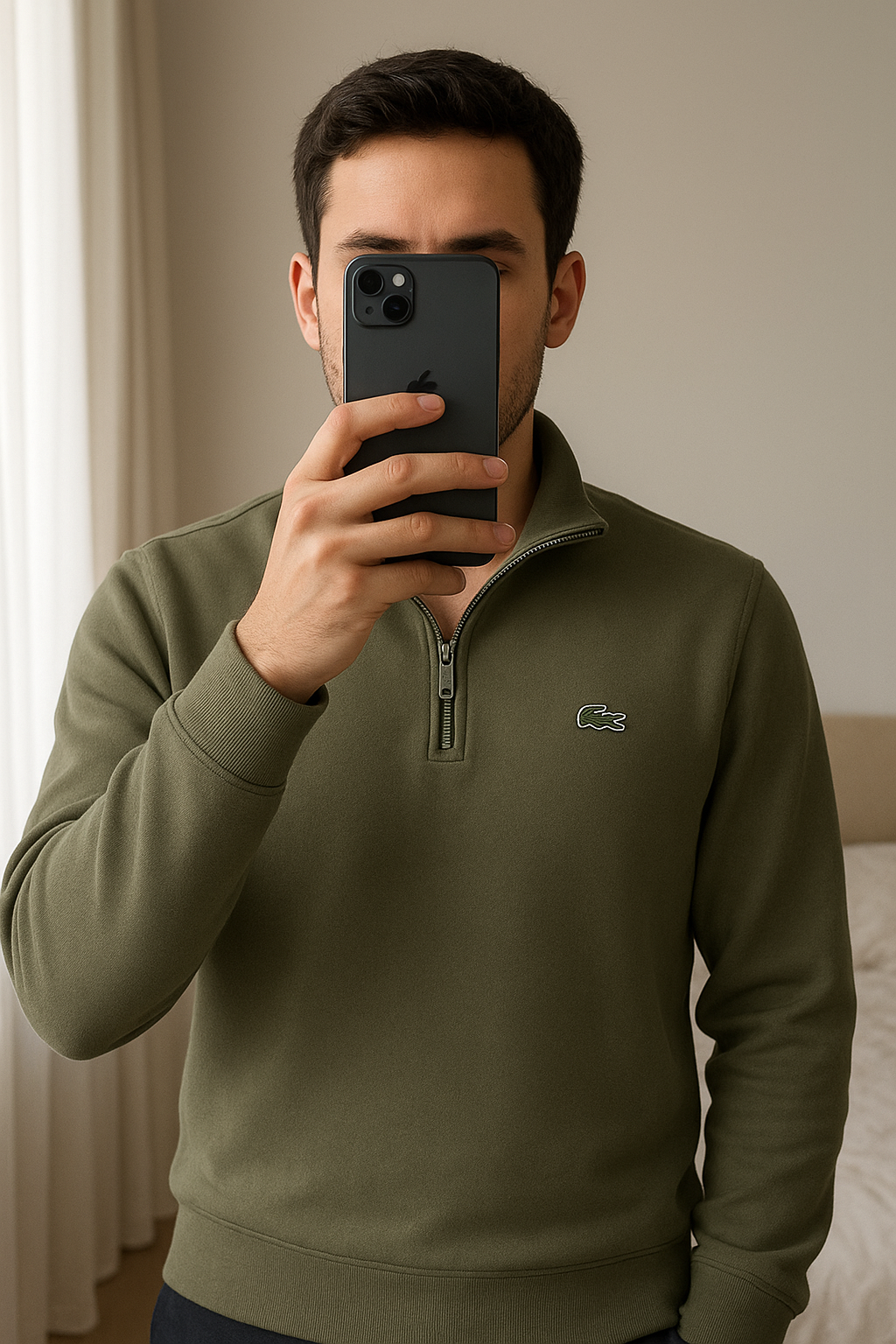 Sweat kaki Lacoste zippé Col camionneur debout, face à la caméra, dans une chambre à la lumière douce, avec une lumière naturelle filtrant par la fenêtre.