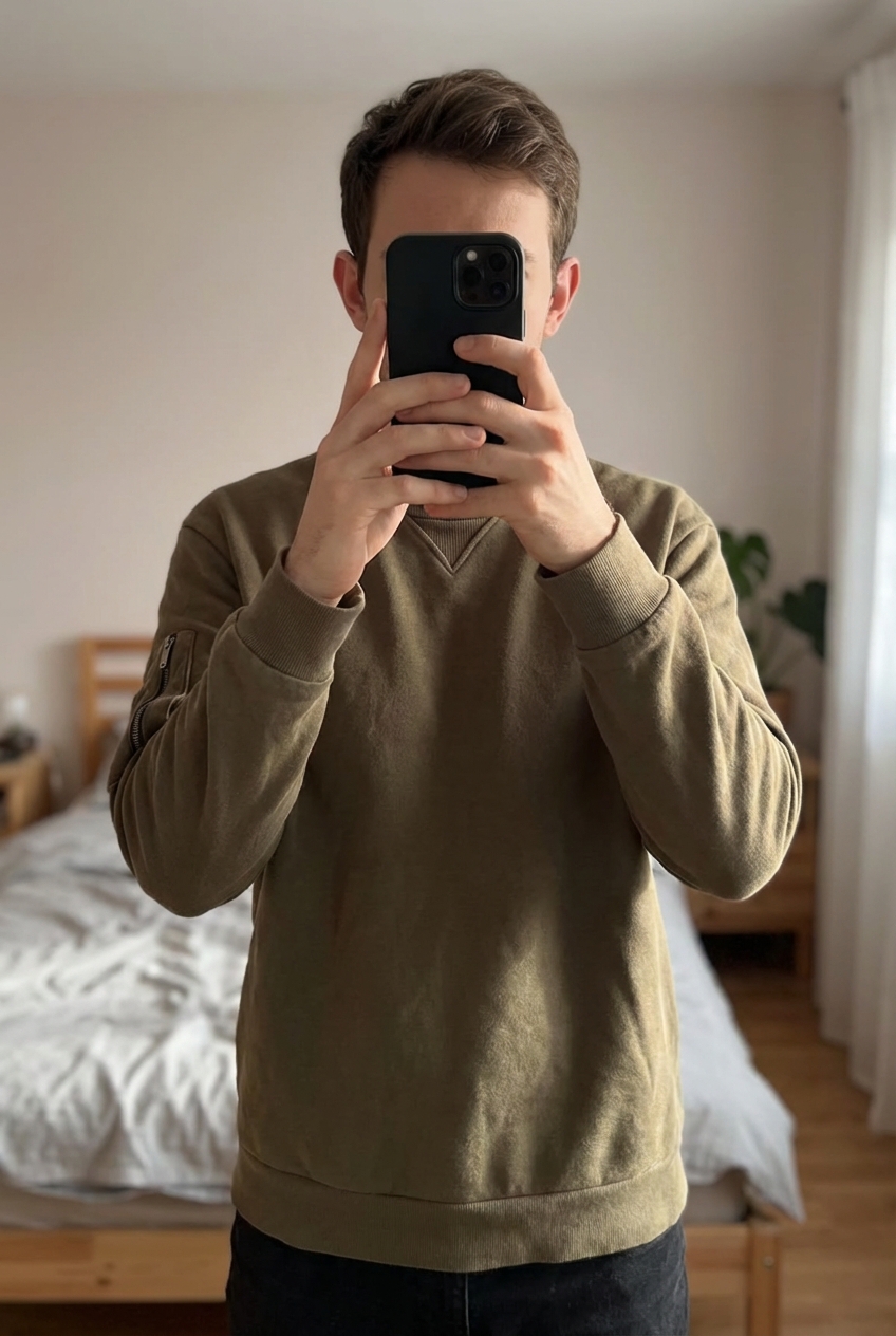 Sweat polaire kaki Zara homme L - felpa in pile Zara in piedi, rivolto verso la fotocamera, in una camera da letto con luce soffusa e luce naturale che filtra dalla finestra.