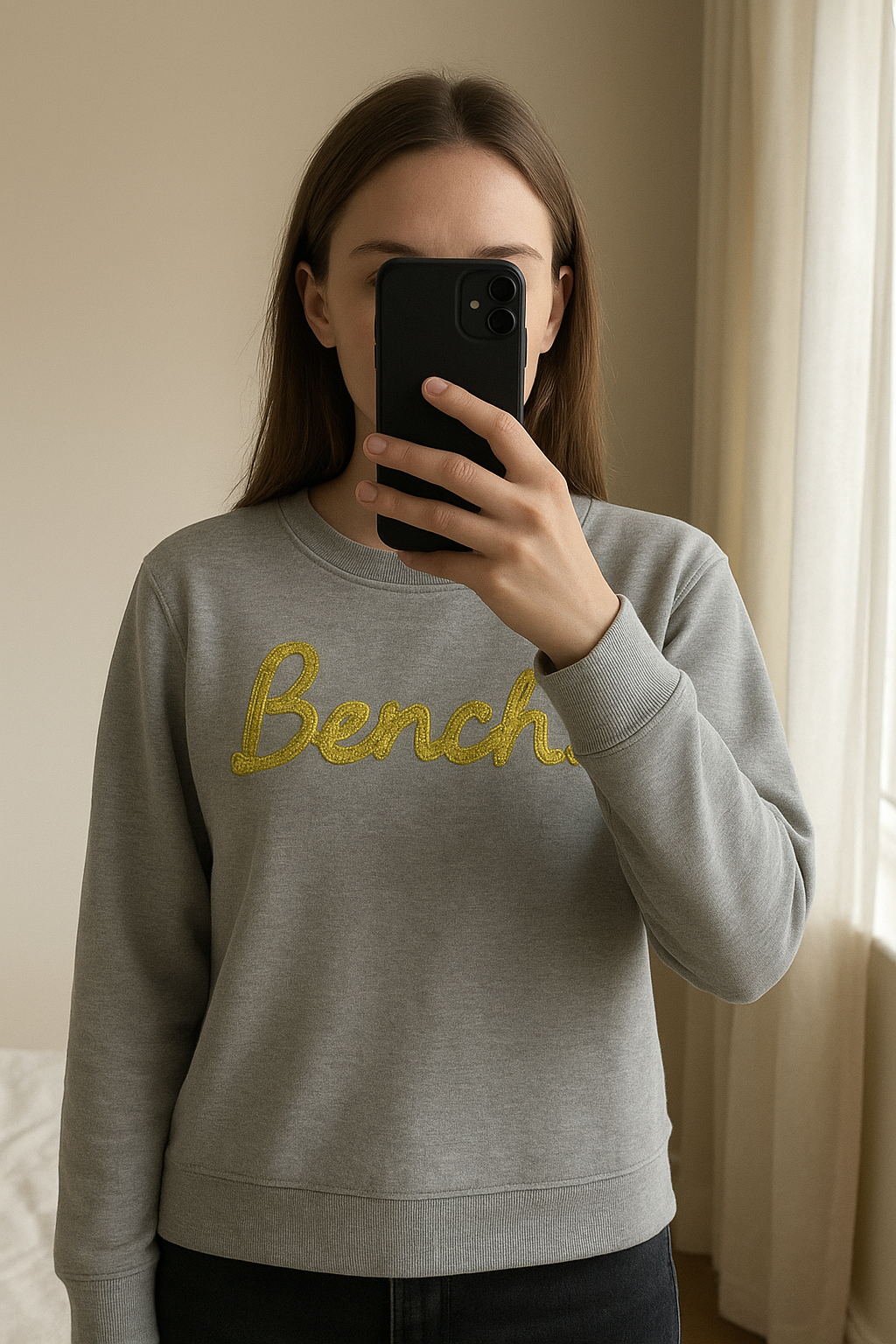 Sweat-shirt Bench taille XL debout, face à la caméra, dans une chambre à la lumière douce, avec une lumière naturelle filtrant par la fenêtre.