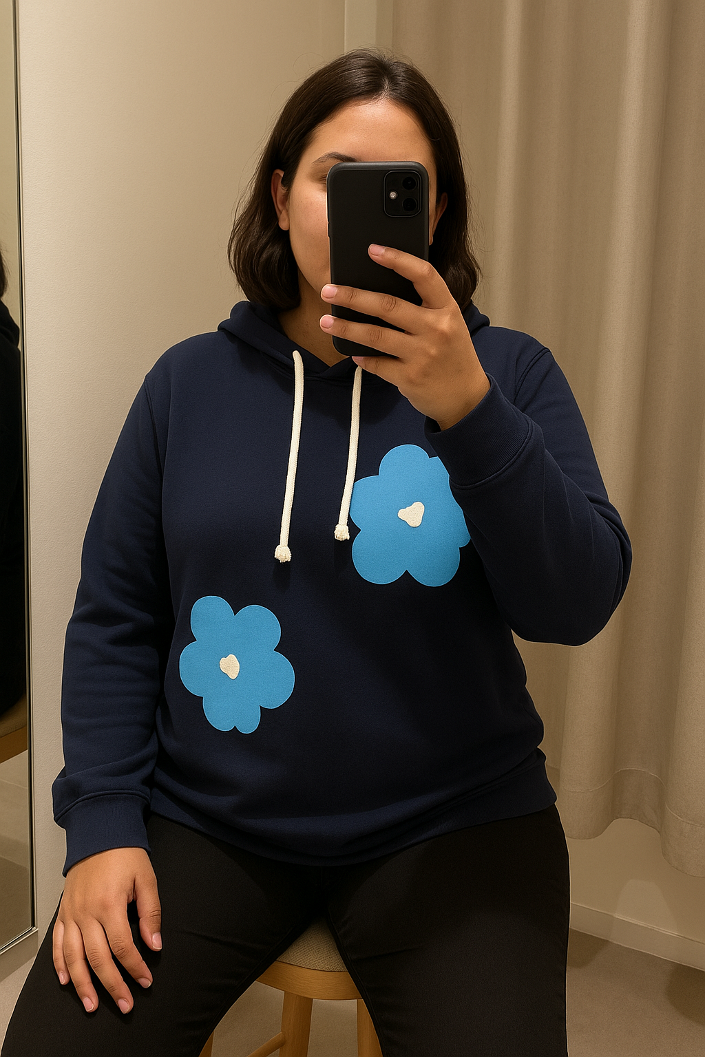 Une personne en Sweat-shirt hoodie Sandro TXL Sandro neuf assis sur une chaise haute, avec une posture détendue, avec une silhouette légèrement plus ronde, dans une cabine d’essayage de style boutique avec un miroir et une décoration neutre.