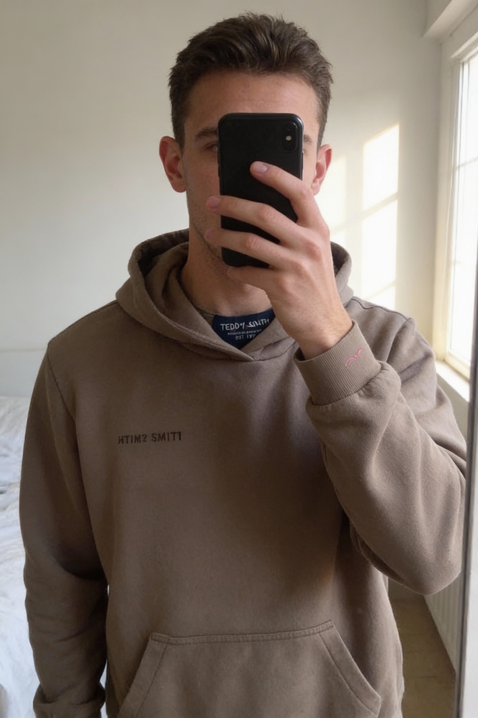 Sweat Teddy Smith 16 ans debout, face à la caméra, dans une chambre à la lumière douce, avec une lumière naturelle filtrant par la fenêtre.