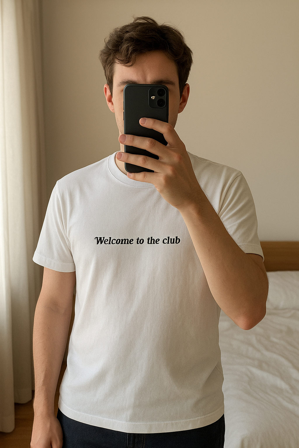 T-Shirt debout, face à la caméra, dans une chambre à la lumière douce, avec une lumière naturelle filtrant par la fenêtre.