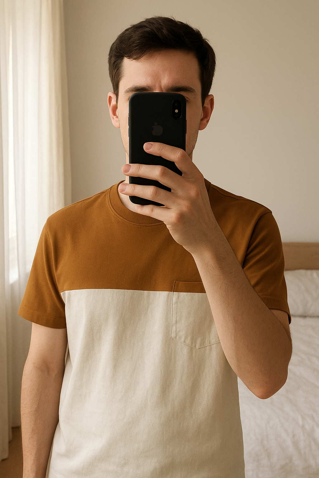 T-shirt Bizzbee Marron & Blanc – Taille M – Très Bon État debout, face à la caméra, dans une chambre à la lumière douce, avec une lumière naturelle filtrant par la fenêtre.