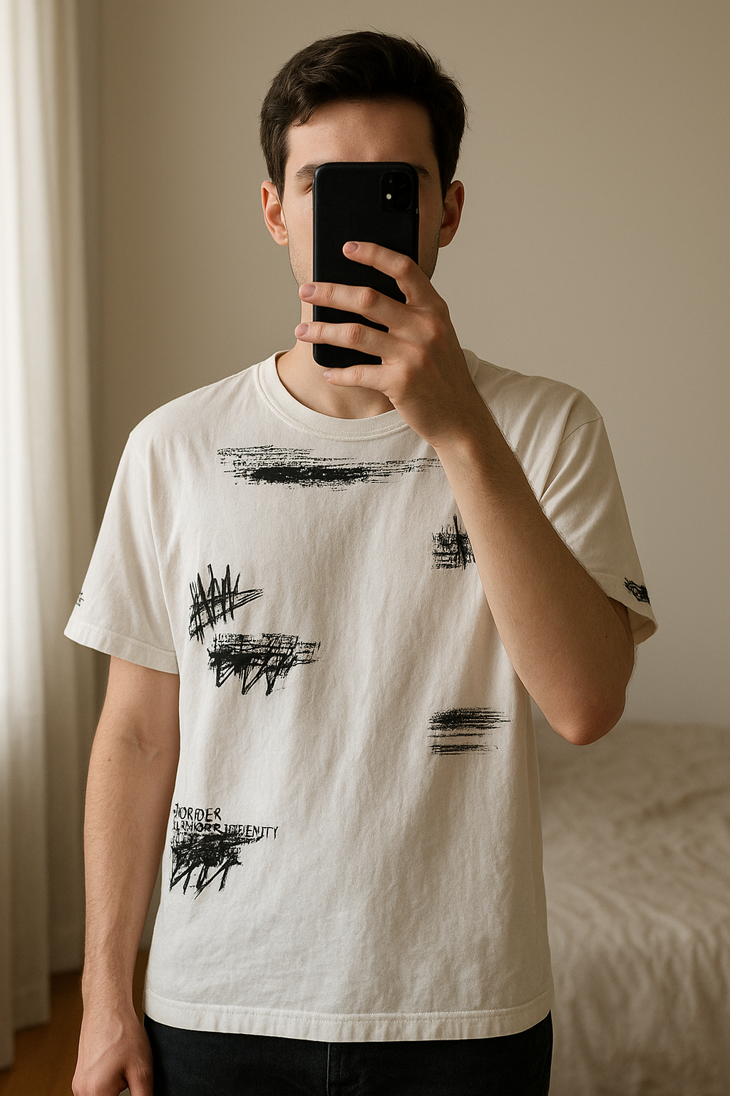 T-shirt blanc Lefties Man – Taille M debout, face à la caméra, dans une chambre à la lumière douce, avec une lumière naturelle filtrant par la fenêtre.