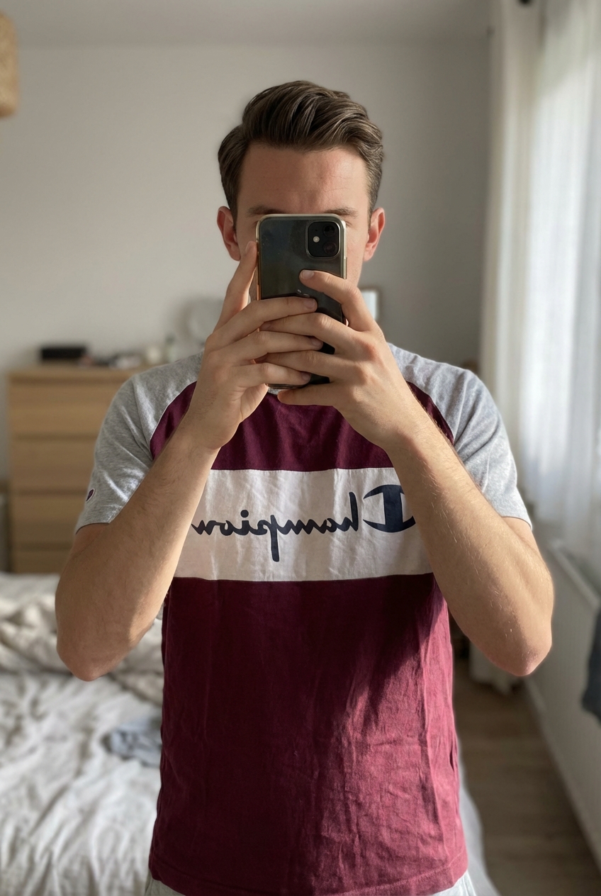 T shirt Champion debout, face à la caméra, dans une chambre à la lumière douce, avec une lumière naturelle filtrant par la fenêtre.