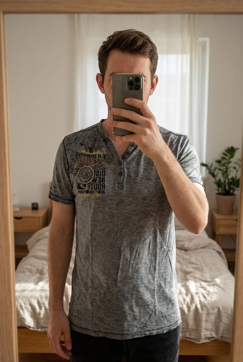 t shirt col v Canda debout, face à la caméra, dans une chambre à la lumière douce, avec une lumière naturelle filtrant par la fenêtre.