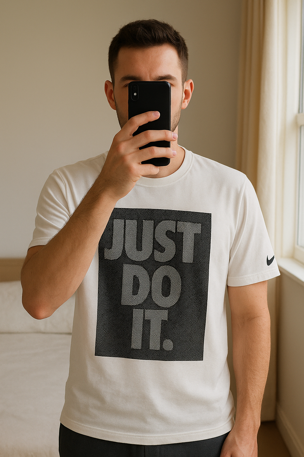 T-shirt homme Nike, taille L debout, face à la caméra, dans une chambre à la lumière douce, avec une lumière naturelle filtrant par la fenêtre.