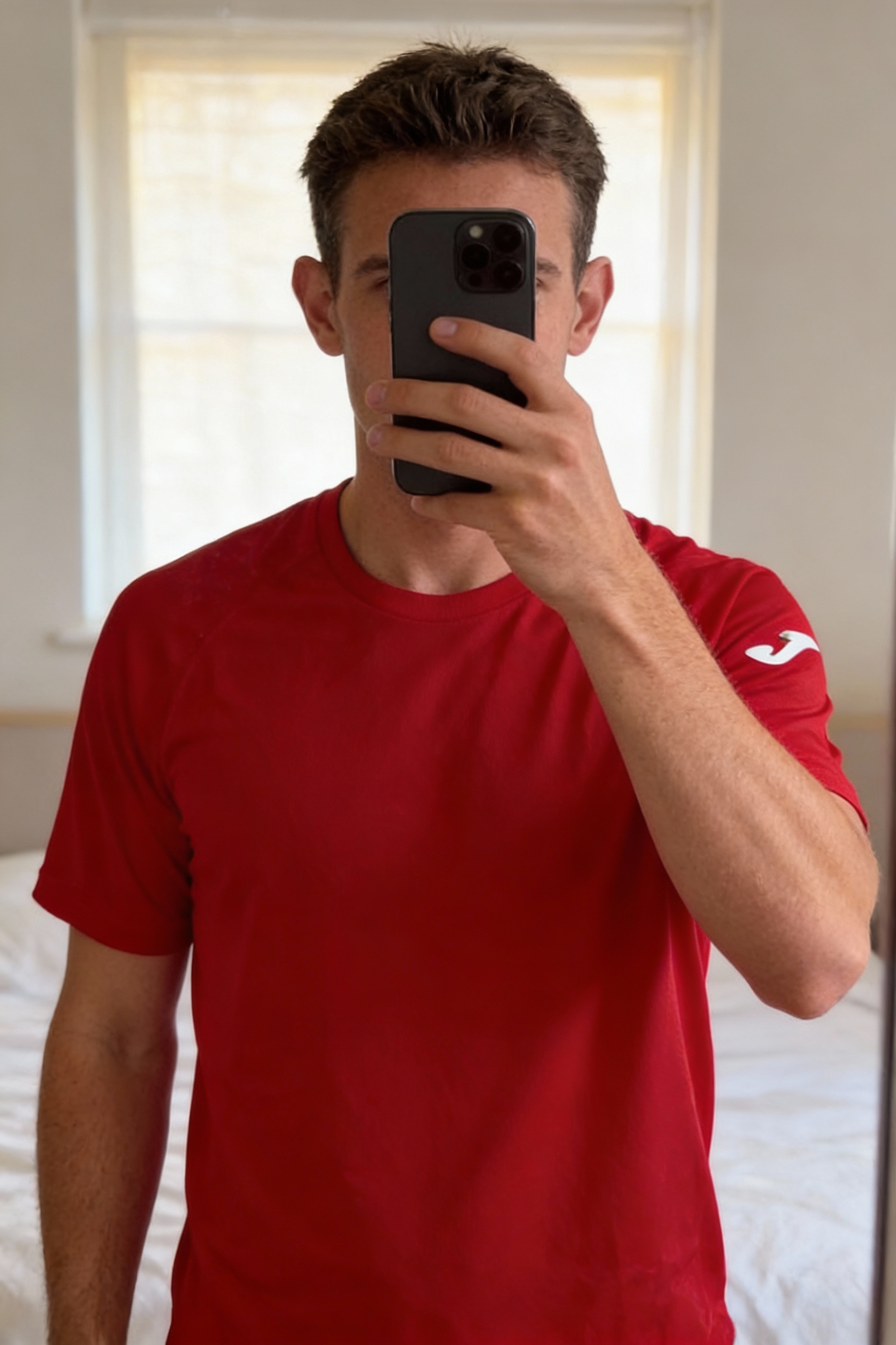 T-shirt Joma Training Rouge Uni debout, face à la caméra, dans une chambre à la lumière douce, avec une lumière naturelle filtrant par la fenêtre.