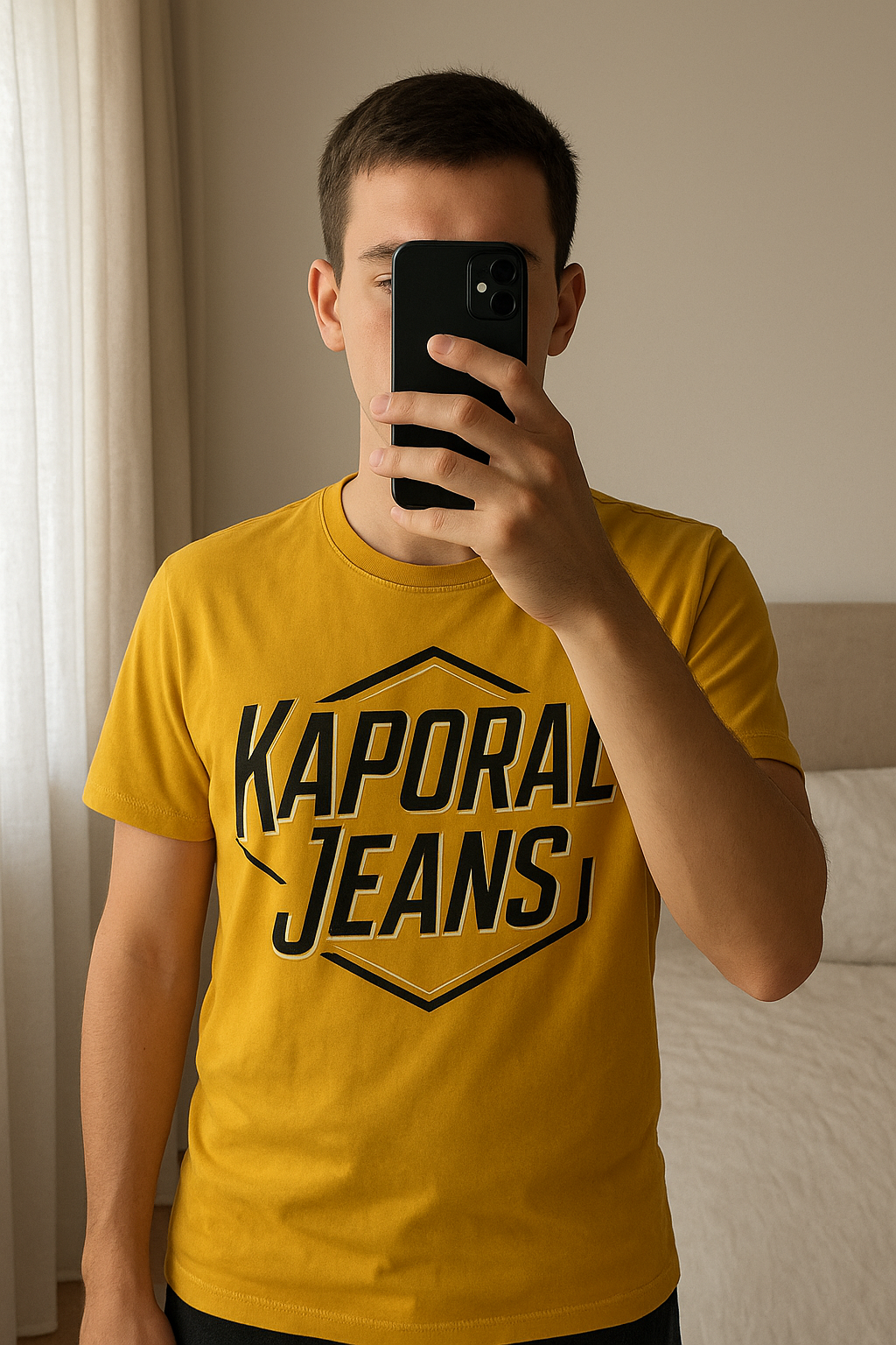 T-shirt Kaporal Jeans jaune 👕 debout, face à la caméra, dans une chambre à la lumière douce, avec une lumière naturelle filtrant par la fenêtre.