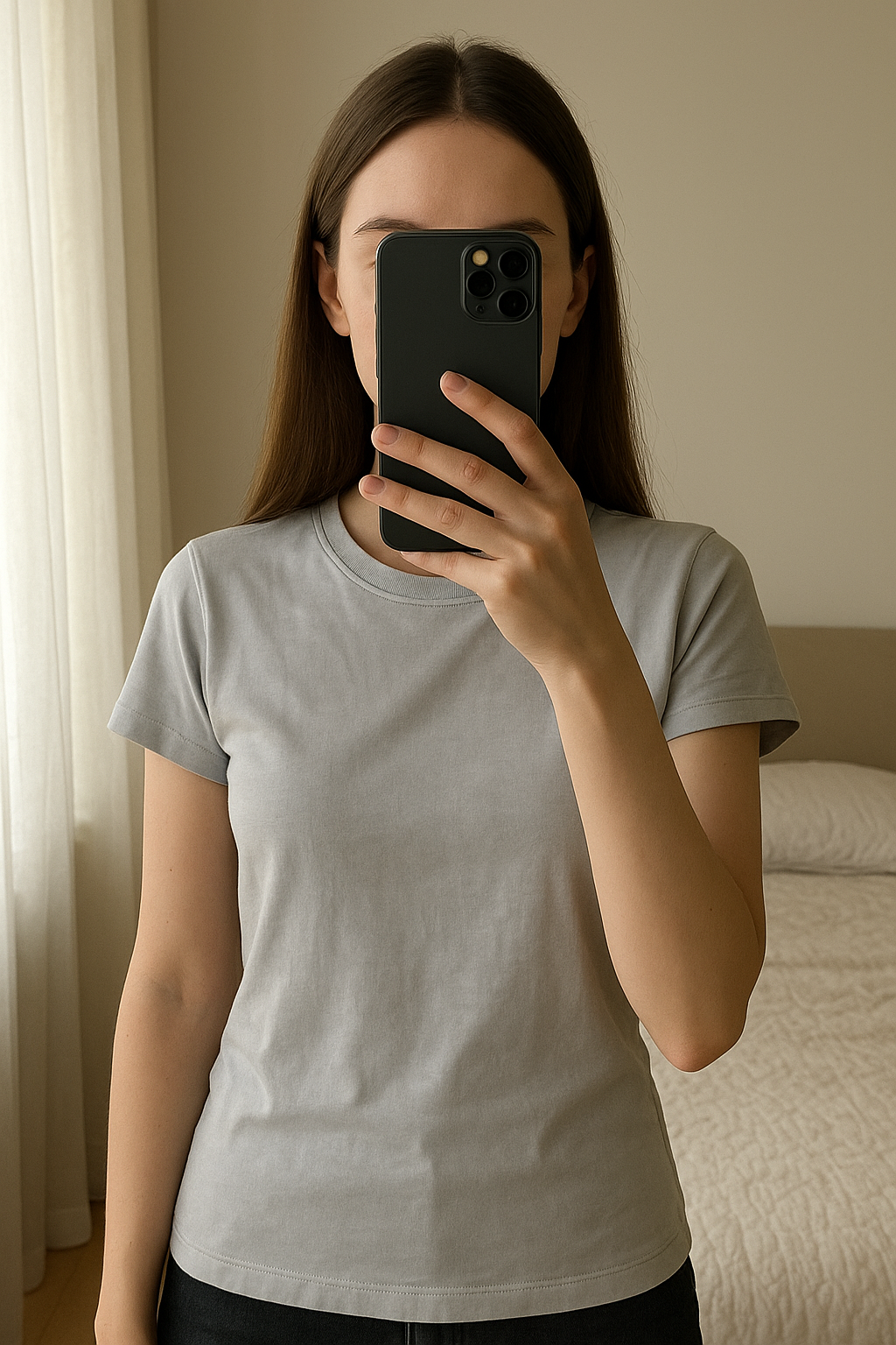 t-shirt à manches courtes blanc moulant debout, face à la caméra, dans une chambre à la lumière douce, avec une lumière naturelle filtrant par la fenêtre.