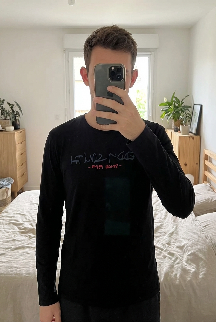 T-shirt manches longues Teddy Smith homme – Taille M – Très bon état debout, face à la caméra, dans une chambre à la lumière douce, avec une lumière naturelle filtrant par la fenêtre.